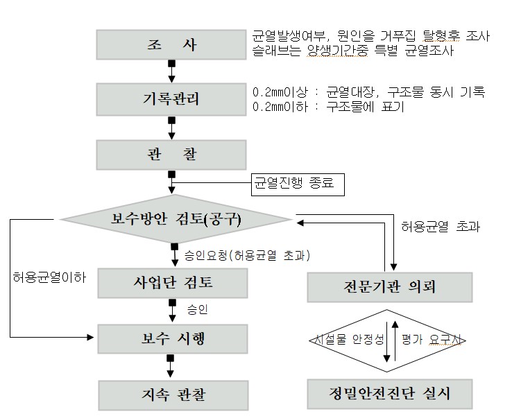 1) 균열폭 0.2mm 이상은 균열대장 및 구조물에 동시 기록, 3개월간 지속적으로 정
